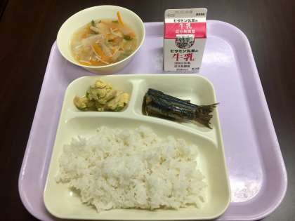 今日の給食は、いわしのしょうが煮、うすくず汁、高野どうふの卵とじでした。いわしはやわらかくて、とても食べやすかったです。