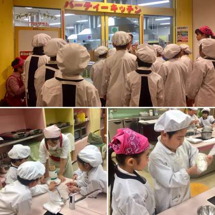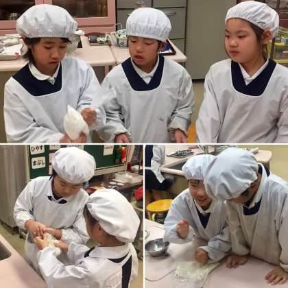 12月12日(木) パーティーキッチン 2年生がキッズプラザに行きました。まず、パーティーキッチンで、大豆について学びました。「畑のお肉」とも呼ばれる大豆のよさに、気づいた後、それを使ってお団子作りの体験をしました。