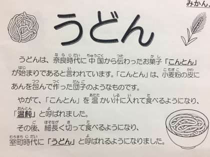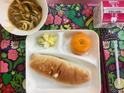 今日の給食は、カレーうどん、はくさいの甘酢あえ、みかんでした。カレーうどんは、あったかくて、しみる味でした。