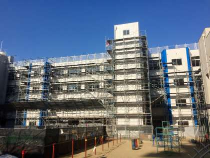 2か月近く校舎を覆っていたシートがはずされ、運動場側の足場の解体が始まりました。すべての工事が終了するのは、2月になります。それでも廊下には日光がさしこみ、とても明るくなりました。