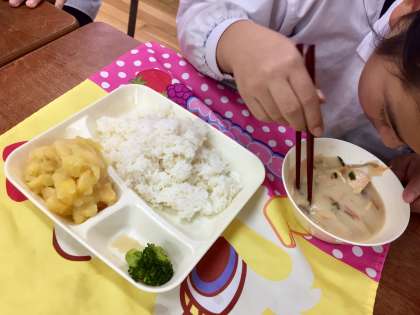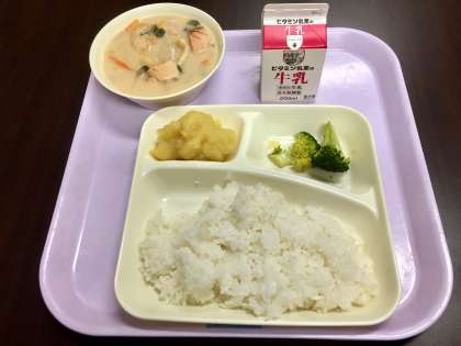 今日の給食は、かす汁、ブロッコリーのしょうがづけ、栗きんとんでした。子どもたちに人気の栗きんとん、大盛りで食べていました。