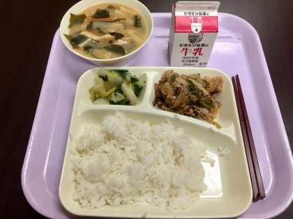 今日の給食は、豚肉のごまだれ焼き、みそ汁、菊菜と白菜のおひたしでした。