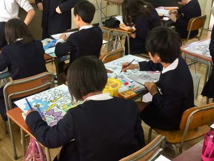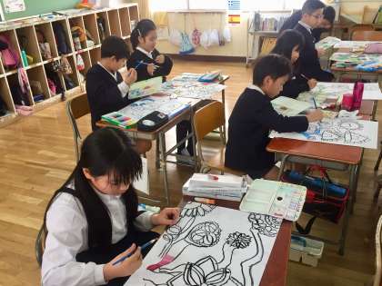 4年生が、草花をもとにしたデザイン画を描いていました。印象に残ったのは、彩色です。自分のイメージする色を探求していました。絵を描くことの楽しさを、子どもたちなりに味わっていました。