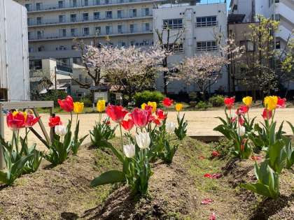 4年生の時に植えたチューリップが、綺麗に咲いています。5年生になった子どもたちに早く会いたいな。