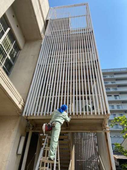 4月30日(木)から、体育館横の非常階段の塗装工事を行っています。