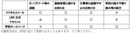 現在、ミマモルメメールと学校ホームページにて、情報を発信していますが、情報発信手段は万が一のために複数あったほうがいいと考えますので、3つ目の手段として、以下のように運用します。