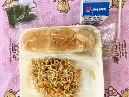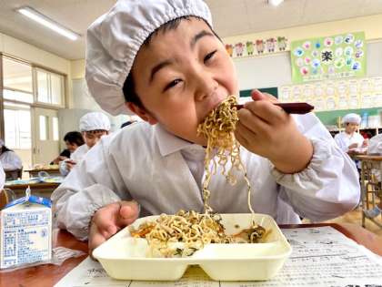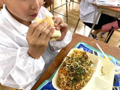 今日の給食は、焼きそばでした。子どもたちが大好きな献立です。しかも量が半端ない。それでも、モリモリ食べるのが大国の子。