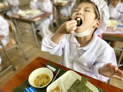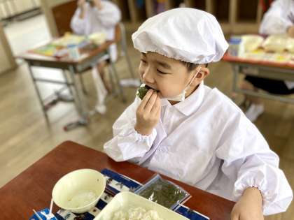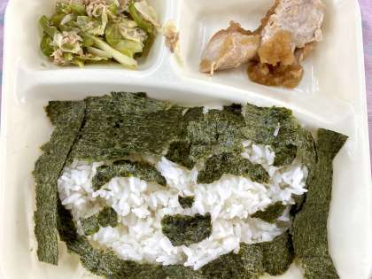 焼きのりにごはんをじょうずに巻いて、手巻おにぎりにして食べていました。キャラ弁風の給食も登場していました。