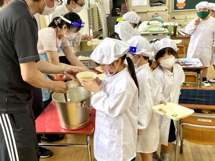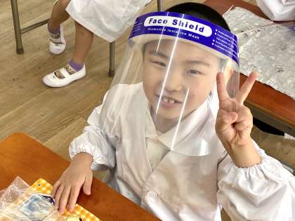 本日より、児童用もフェイスシールドを活用しています。暑さへの配慮から授業中では主にマスクですが、給食の配膳時にはできるだけ着用しています。