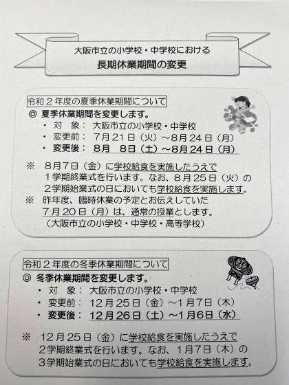 大阪市教育委員会の通知により、長期休業期間を以下の通り変更いたします。