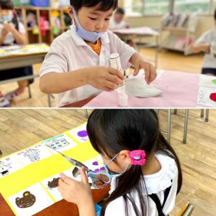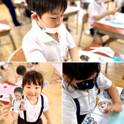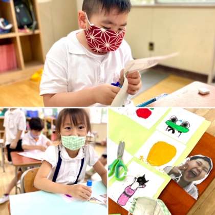 1年生は、どんな学習をしていても、楽しそうです。自分の好きなものを描いて、写真を貼り付け、自己紹介シートを作っていました。いい作品がいっぱいでした。