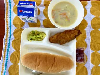 今日の給食は、サーモンフライ、豆乳スープ、キャベツのカレーソテーでした。おいしそうに、食べていました。
