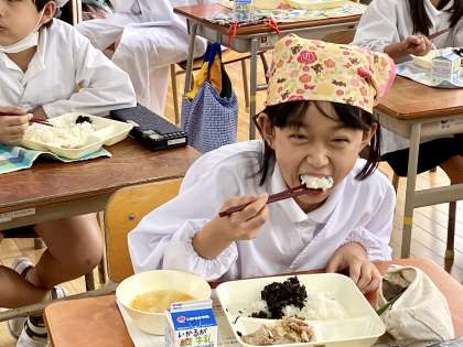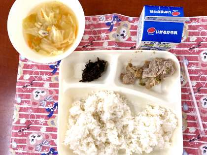 今日の給食は、豚肉のごまみそ焼き、すまし汁、のりのつくだ煮でした。子どもたちは、つくだ煮が好きで、ごはんがすすみます。もりもり食べて、元気になあれ。