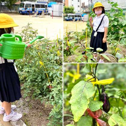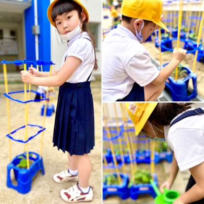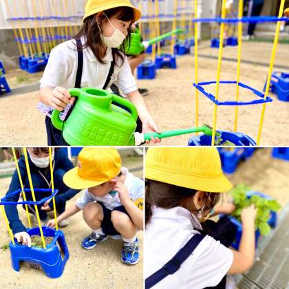 1年生のあさがおは、どんどん成長しています。今日は支柱をつけました。あさがおのツルがまきついて、もっともっと伸びていくことでしょう。