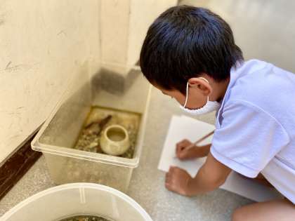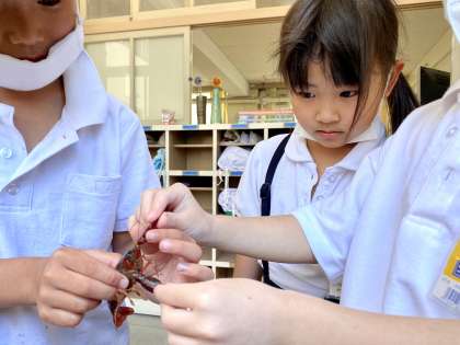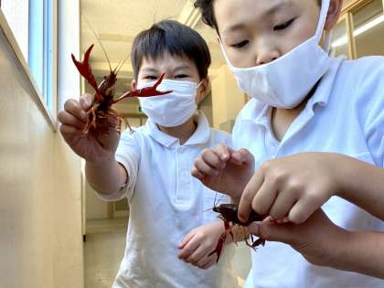 1年生も2年生も、ザリガニには夢中です。観察したり、さわったり。