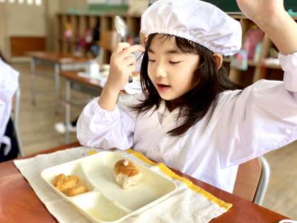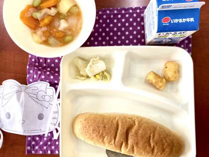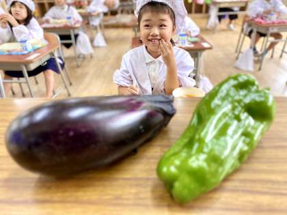 今日の給食は、いかの天ぷら、フレッシュトマトのスープ煮、サワーソテーでした。1年生の教室には、収穫したばかりのなすとピーマン。これからも、どんどんできるといいね。