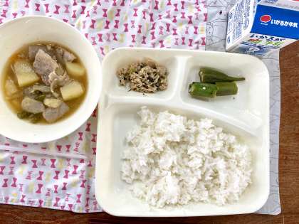 今日の給食は、豚肉とじゃがいもの煮物、オクラの梅風味、ツナっ葉いためでした。