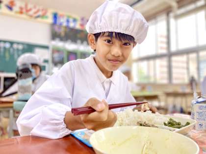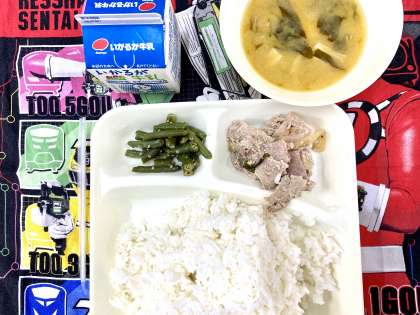 今日の給食は、豚肉のしょうが焼き、みそ汁、三度豆のごまあえでした。ご飯がすすむ献立に、みんな笑顔でした。