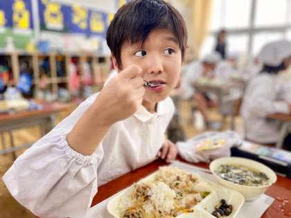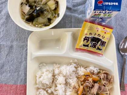 今日の給食は、豚丼、すまし汁、いり黒豆でした。けっこう山盛りにして、食べていました。夏バテ対策は大丈夫みたいです。