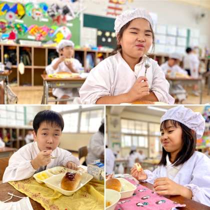 今日の給食は、マカロニグラタン、スープ、りんご(カット缶)でした。グラタンは好評で、喜んで食べていました。