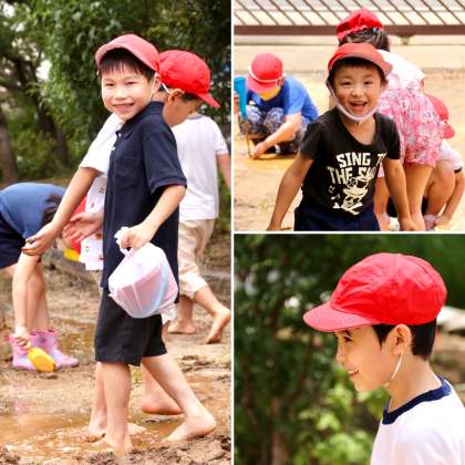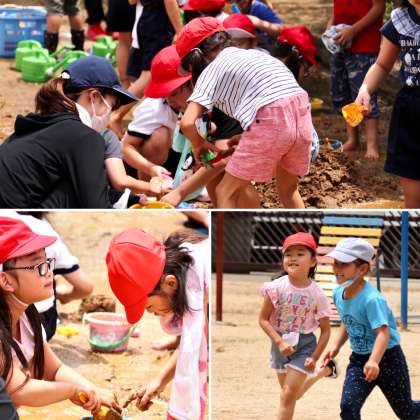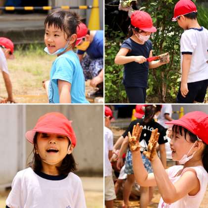1年生は、泥んこ遊びをしました。プールに入れない分を、水と泥で楽しみました。