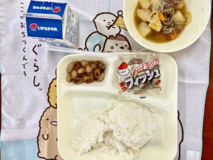 今日の給食は、肉じゃが、とら豆の煮物、アーモンドフィッシュでした。みんな肉じゃがは大好きで、ご飯も進んでいました。