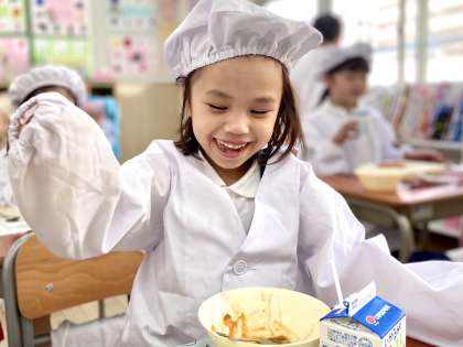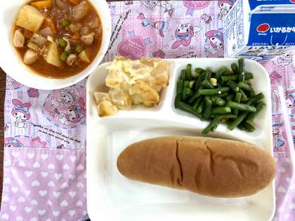 今日の給食は、ケチャップ煮、さんどまめとコーンのソテー、リンゴのクラフティでした。子どもたちが苦労していたのは、意外なことにリンゴのクラフティ。このごろは、フルーツが苦手だという子どもがふえました。