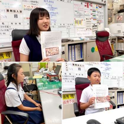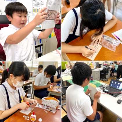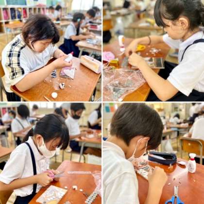 Teams朝会で、児童代表が「ゲルニカ」について説明をし、全校児童で製作を開始しました。材料は革を使います。小さく切った革を下絵が書いてある板にボンドではっていきます。そして、板の裏に、命についての願いと名前を書き込みました。