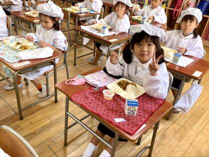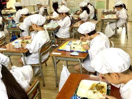 今日の給食は、牛肉と大豆のカレーライス(米粉)、きゅうりのピクルス、りんごのゼリーでした。学校でみんなと一緒に食べるカレーライスは、本当においしいです。