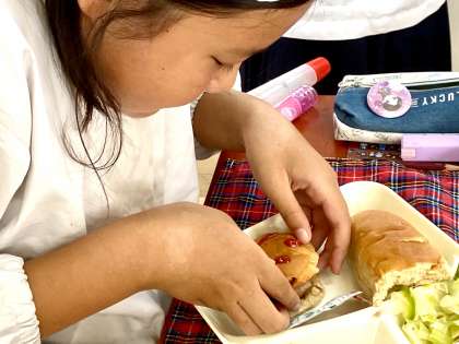 今日の給食は、焼きハンバーグ、豆乳スープ、キャベツとピーマンのソテーでした。じょうずにパンにはさんで、ハンバーガーにしていました。とてもおいしそうでした。