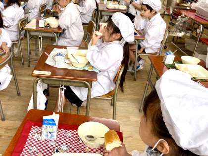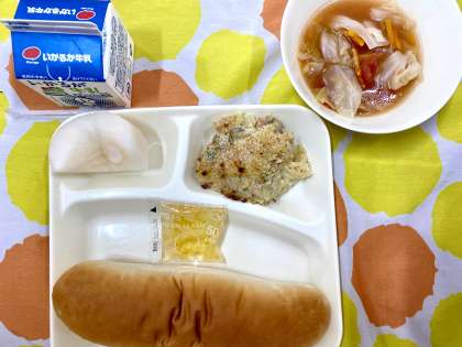 今日の給食は、豆乳マカロニグラタン、トマトスープ、二十世紀なしでした。