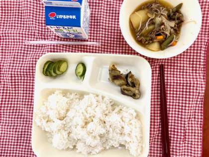 今日の給食は、肉じゃが、焼きなすのみそだれかけ、あっさりきゅうりでした。肉じゃがは、人気献立ですから、ご飯も進みます。はやくに食べ終わる子もいました。