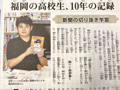 梅田明日佳さんは、小学校3年生から10年間、ずっと新聞の切り抜きをして感想を書くという活動を続けています。自学ノートは、実に32冊になります。
