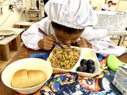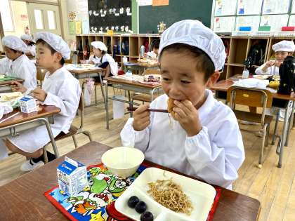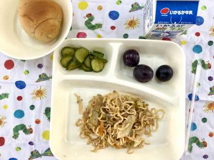 今日の給食は、焼きそば、きゅうりのしょうがづけ、ぶどうでした。いつものように、たっぷりと量がありましたが、たくましい食欲でした。