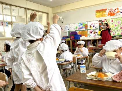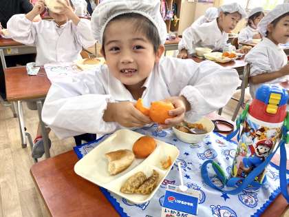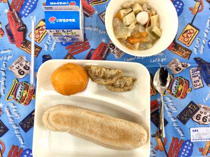 今日の給食は、あげぎょうざ、中華煮、冷凍みかんでした。まだまだ蒸し暑いですから、冷たいみかんは、おいしいです。じゃんけんで2つ目をゲット!