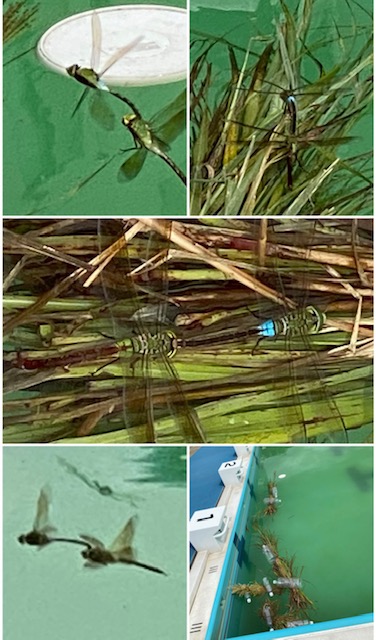 9/8(火)に1・2年生の児童が、ビオトープに生えるススキ等を使って浮島を作り、プールに浮かべました。今日、プールを見に行くと、グロスジギンヤンマと思われるトンボの姿が!プール周辺を飛び回りながら一生懸命に浮島に産卵をしていました。