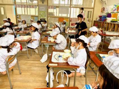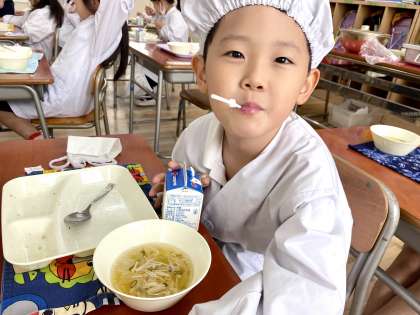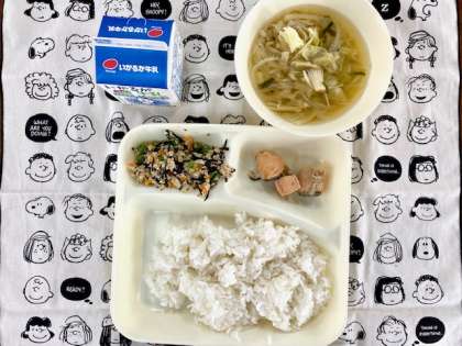 今日の給食は、さけのしょうゆ風味焼き、五目汁、荒野どうふの炒り煮でした。さけの切身をおいしそうに食べていました。