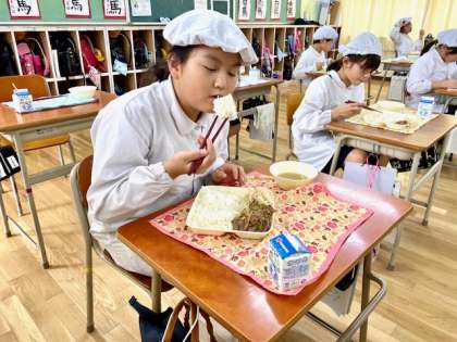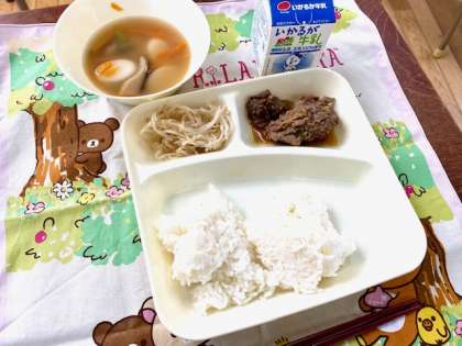 今日の給食は、プルコギ、トック、もやしの甘酢あえでした。子どもたちに人気のある献立です。天高く馬肥える秋です。