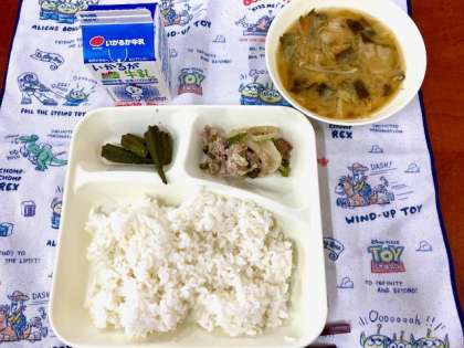 今日の給食は、豚肉の甘辛焼き、みそ汁、オクラのおかかいためでした。明日の運動会にむけてモリモリ食べて、パワーをつけていました。