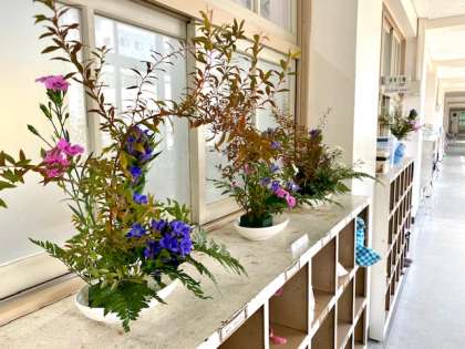 6年生の教室前は、一段と華やかです。一人ひとりが生けた花が置かれています。華道は室町中期に京都六角堂の僧侶によって確立されたものとされています。その文化を感じながら、心を落ち着けるのも大切な学習です。