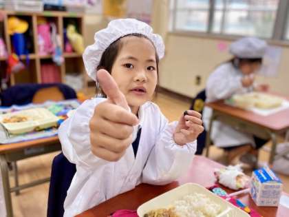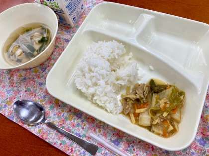 今日の給食は、ピリ辛丼、中華スープ、ソフト黒豆でした。ピリ辛丼は、人気献立で、山盛りにして食べている子がたくさんいました。