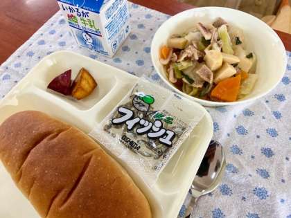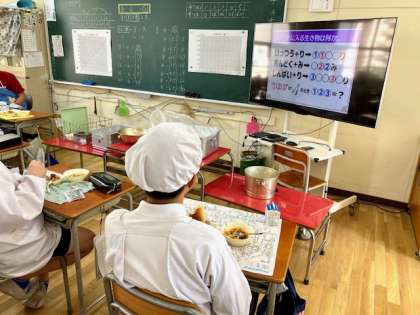 今日の給食は、豚肉とイカの中華煮、大学いも、ミニフィッシュでした。6年生は、モニターにクイズを映して、みんなで考えていました。真剣に考えていると、ほんとうに静かです。