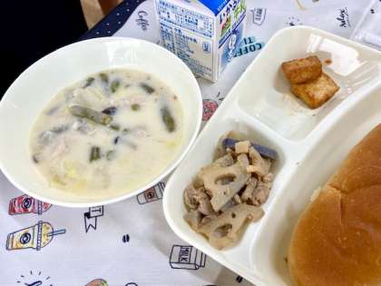 今日の給食は、白菜のクリーム煮、あつあげのピリ辛しょうゆがけ、豚肉とれんこんのオイスターソース炒めでした。どれも好評でしたが、やはりあつあげが人気でした。