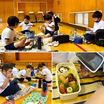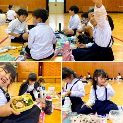 1・2年生は、体育館でお弁当を広げました。遠足には行けなかったけれど、気分は最高でした。