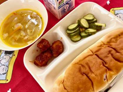今日の給食は、マグロのオーロラ煮、ベーコンとじゃがいものスープ、きゅうりとコーンのゆずドレッシングでした。子どもたちに人気のオーロラ煮は、すぐに売り切れていました。おいしかったね。