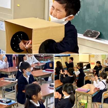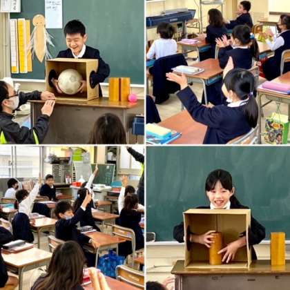1年生の算数です。箱の中のものを手でさわりながら、形をあてるゲームをしていました。おそるおそるさわっている様子が、みんなから大うけでした。