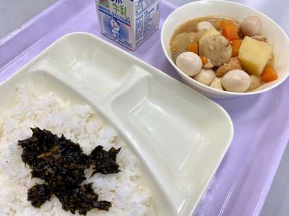 今日の給食は、関東煮、のりのつくだ煮でした。本日の献立として予定されていた白菜の甘酢あえですが、食材の白菜に複数の松葉が混入しており、安全性を優先して調理を中止いたしました。