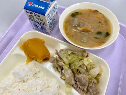 今日の給食は、豚肉とまいたけの炒め物、つみれ汁、かぼちゃのういろうでした。つみれ汁やういろうは、苦手だという子がいます。以前の関西人は納豆が苦手だというのも、なれていないことが原因で、今ではよく食べられています。