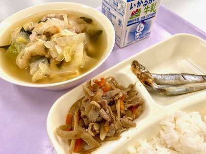 今日の給食は、焼きししゃも、五目汁、きんぴらごぼうでした。なまり節に続いてししゃもとの格闘です。よくがんばりました。
