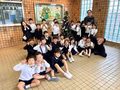 1年生がとても楽しみにしていたツリー。みんなでオーナメントをつけました。キラキラと輝くツリーは、2学期の終了まで光り続けます。